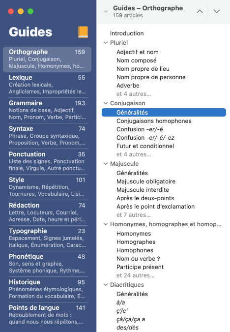 La table des matières s’affiche dans les panneaux de gauche de la fenêtre des guides et présente deux niveaux de consultation : guides et articles. Dans le premier panneau, chaque guide est accompagné du nombre d’articles qu’il contient, ainsi que d’un condensé de quelques-uns des thèmes abordés. Sélectionnez un guide pour en voir le contenu — thèmes, sous-thèmes et articles — dans le second panneau; ensuite, sélectionnez-y l’article désiré.