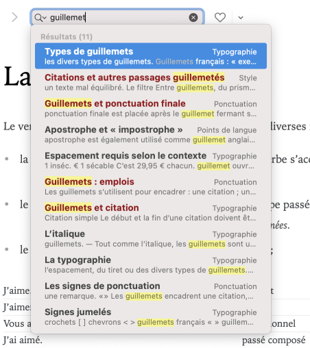 Pour consulter un article, sélectionnez le résultat correspondant. Pour un repérage rapide, toutes les occurrences de l’expression recherchée sont surlignées dans l’article.