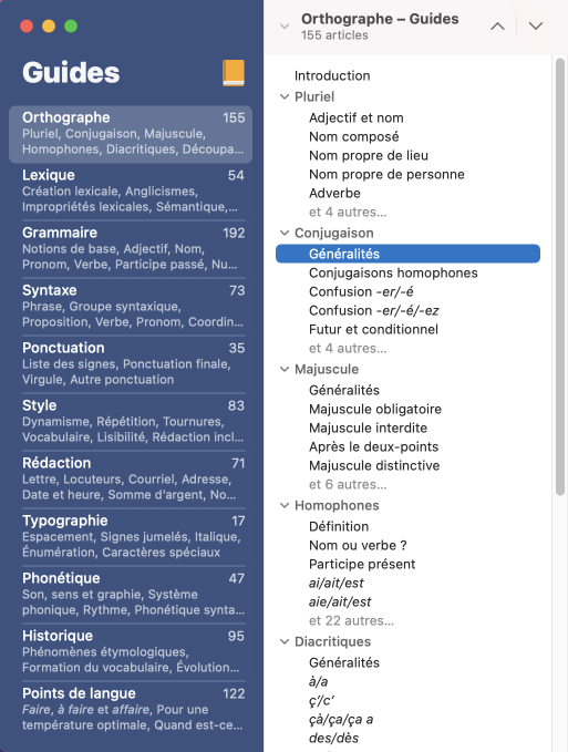 La table des matières s’affiche dans les panneaux de gauche de la fenêtre des guides et présente deux niveaux de consultation : guides et articles. Dans le premier panneau, chaque guide est accompagné du nombre d’articles qu’il contient, ainsi que d’un condensé de quelques-uns des thèmes abordés. Sélectionnez un guide pour en voir le contenu — thèmes, sous-thèmes et articles — dans le second panneau; ensuite, sélectionnez-y l’article désiré.