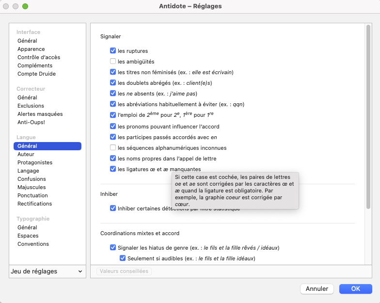 Sur la figure ci-dessous, le réglage de correction des ligatures manquantes est coché : le correcteur remplacera foetus par fœtus (ligature obligatoire). Le survol du curseur au-dessus de chaque réglage, puis de chacune de ses valeurs, le cas échéant, fait jaillir une bulle explicative conçue pour éclairer vos choix.
