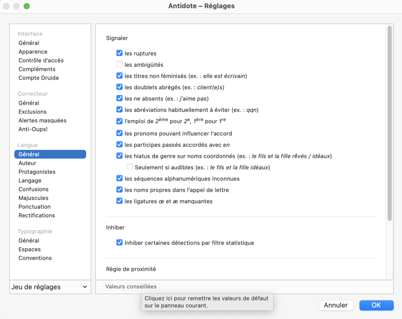 Cliquez sur le bouton Valeurs conseillées au bas de la fenêtre pour appliquer les valeurs de défaut. Notez que les valeurs conseillées de certains réglages (confusions, faux amis, etc.) peuvent varier en fonction du réglage d’habileté en français écrit (panneau Auteur). Par exemple, si vous avez signalé à Antidote que le français n’est pas votre langue maternelle ou si vous avez indiqué que votre maitrise du français écrit est plutôt faible, les valeurs conseillées pour les réglages Confusions lexicales seront automatiquement ajustées à leur sensibilité maximale.