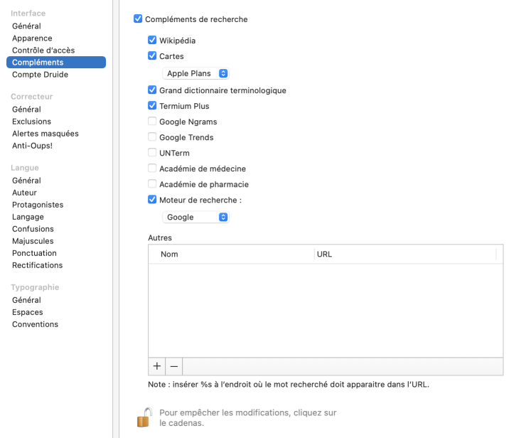 La section Compléments du panneau des précisions du dictionnaire de définitions peut afficher un lien direct vers des outils de recherche en ligne pensés pour enrichir votre exploration du mot consulté. Pour opérer votre sélection, cliquez d’abord sur l’icône du cadenas et fournissez les paramètres d’un compte administrateur.