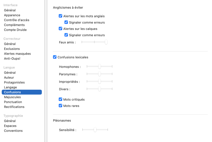 - À l’installation, ces réglages sont ajustés à une sensibilité moyenne si vous avez jugé bonne ou excellente votre habileté en français écrit (au panneau Auteur); ils sont ajustés à une sensibilité maximale si vous avez jugé plutôt faible votre habileté en français écrit, ou si votre langue maternelle n’est pas le français. Pour taire toutes les alertes pouvant résulter de ces réglages sans avoir à réduire chacun à la sensibilité minimale, décochez la case générale de la zone (en haut à gauche).