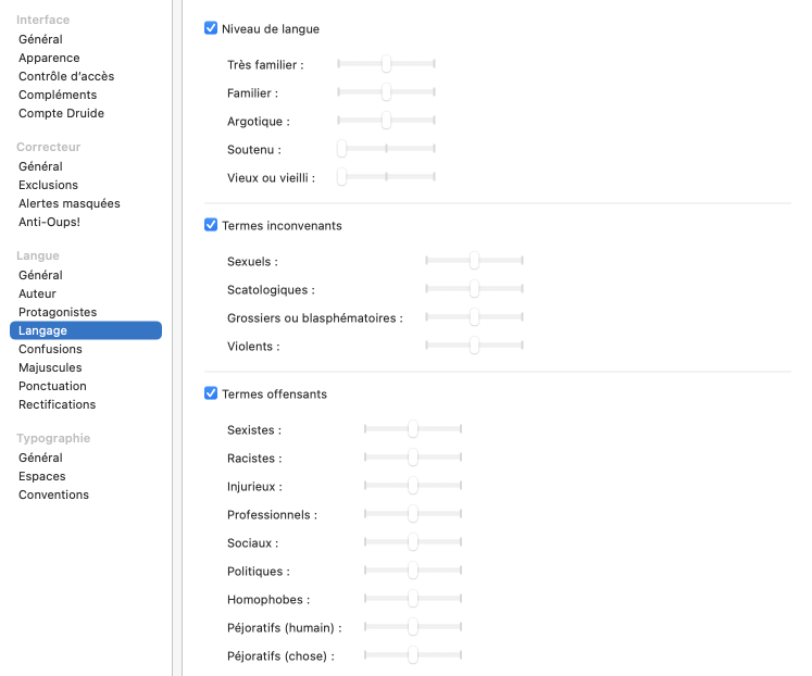 À l’installation, les réglages de langage sont ajustés à une sensibilité moyenne (à l’exception des réglages de niveau de langue Soutenu et Vieux ou vieilli, qui sont ajustés au niveau minimal). Pour taire toutes les détections pouvant résulter de ces réglages sans avoir à réduire chacun à la sensibilité minimale, décochez la case générale de la zone (en haut à gauche).