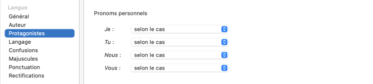 - À l’installation, ces réglages sont ajustés à la valeur Selon le cas : le genre et le nombre dépendent du contexte. Nous vous recommandons de les ajuster selon le nombre et le sexe des personnes désignées par ces pronoms chaque fois que cela est possible.