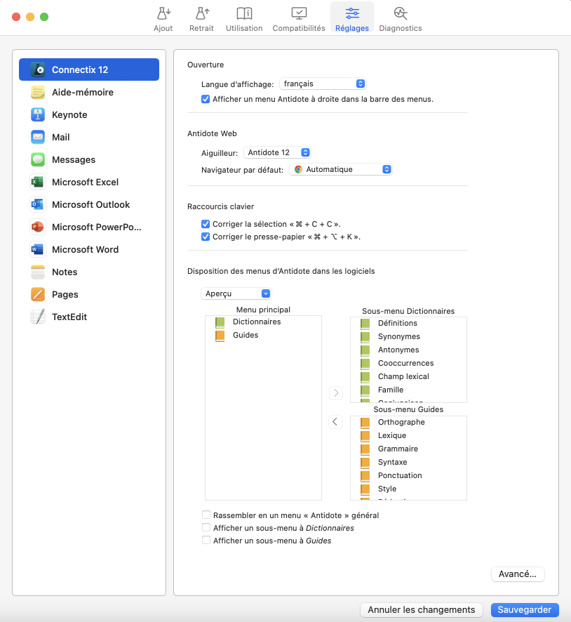 La liste dans la colonne de gauche détermine les éléments présentés au premier niveau du menu contextuel, alors que les deux listes à droite présentent ceux des sous-menus des dictionnaires et des guides linguistiques. Cliquez-glissez un élément pour le faire passer d’un niveau à l’autre ou changer son ordre d’apparition.