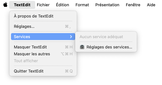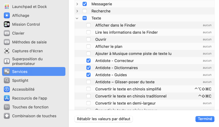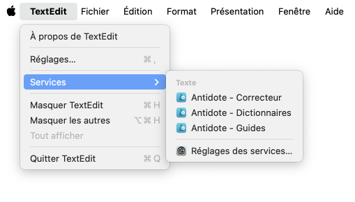 Pour faire apparaitre les outils d’Antidote dans les Services macOS, vous devez d’abord les activer. Cette opération n’est requise qu’une seule fois.