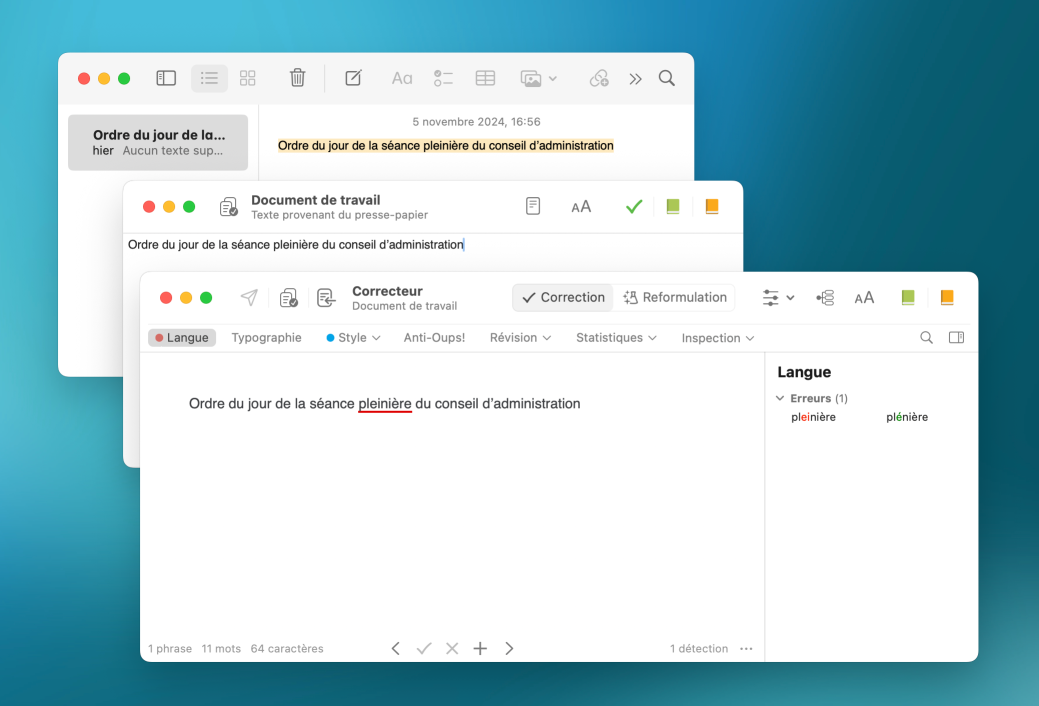 La fenêtre du correcteur d’Antidote, accompagnée d’un document interne, s’ouvre automatiquement et analyse directement le texte copié.