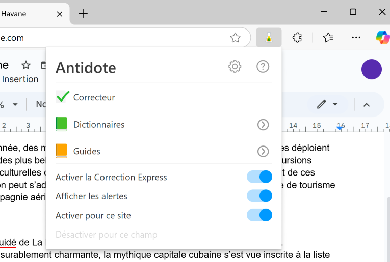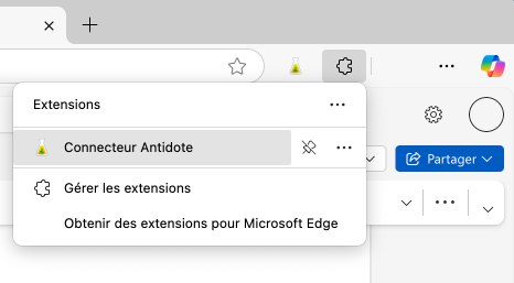L’option Poursuivre dans Antidote 12 ou Poursuivre dans Antidote Web vous est proposée au survol de la souris sur l’icône de la fiole. Cette commande ouvre une fenêtre du correcteur Antidote. Un clic sur l’icône exécute aussi cette commande.