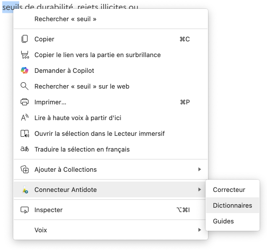 Sélectionnez le texte à corriger ou le mot à rechercher, puis faites un clic droit pour faire appel aux ouvrages d’Antidote à partir du menu contextuel qui s’affiche.