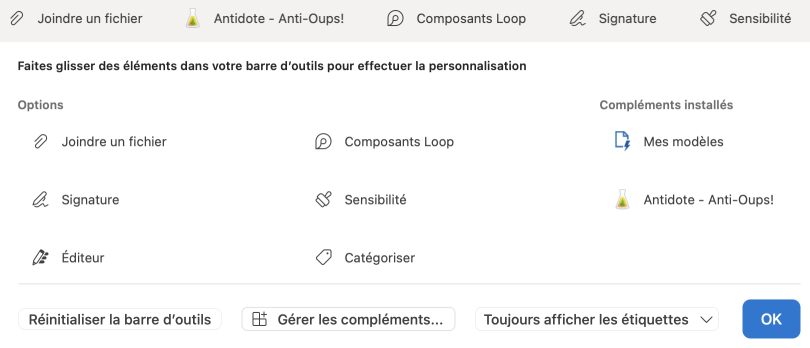 Pour faciliter l’accès au menu Antidote, revenez à votre fenêtre de courriel, cliquez de nouveau sur , puis sur Personnaliser la barre d’outils.