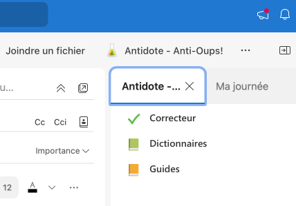 - Cliquez sur l’onglet Antidote - Anti-Oups!. Un panneau de menu s’affichera à droite de la fenêtre de rédaction de votre courriel.