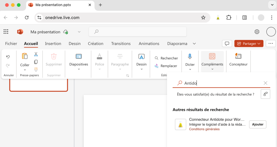 Si ce n’est déjà fait, ajoutez le Connecteur Antidote pour Word, Excel, PowerPoint et One Note.