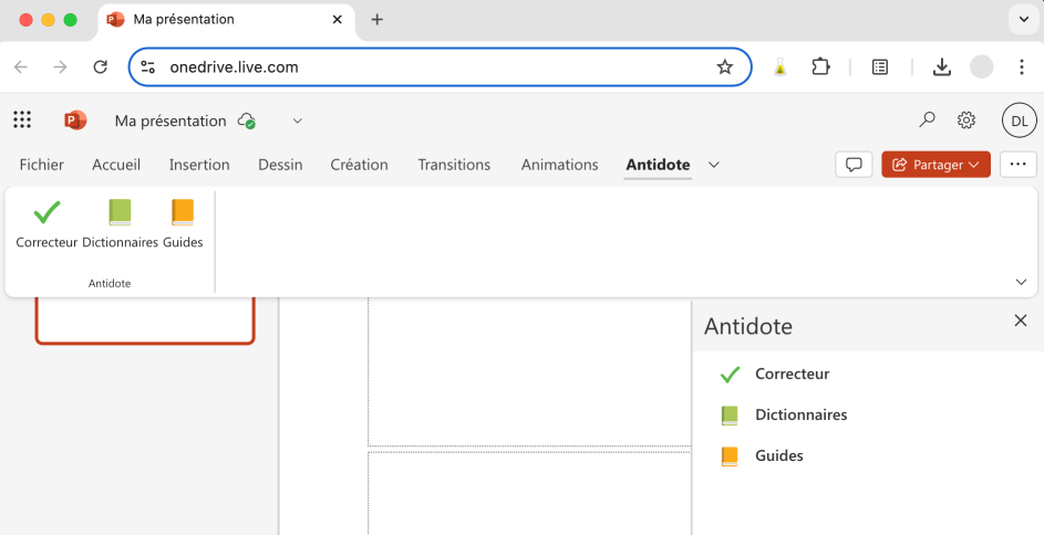 Il existe plusieurs façons d’utiliser Antidote dans un document PowerPoint.