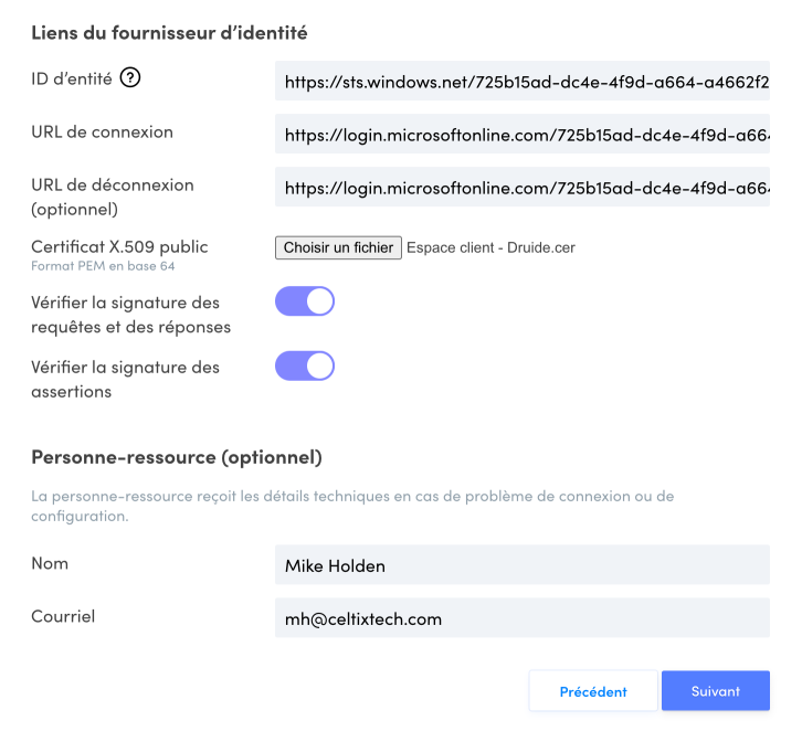 Retournez dans la fenêtre de l’Espace client et poursuivez la configuration à l’Étape 2 : Configuration SAML. Vous aurez besoin des informations dans la fenêtre d’Entra ID laissée ouverte à la fin de la partie C.