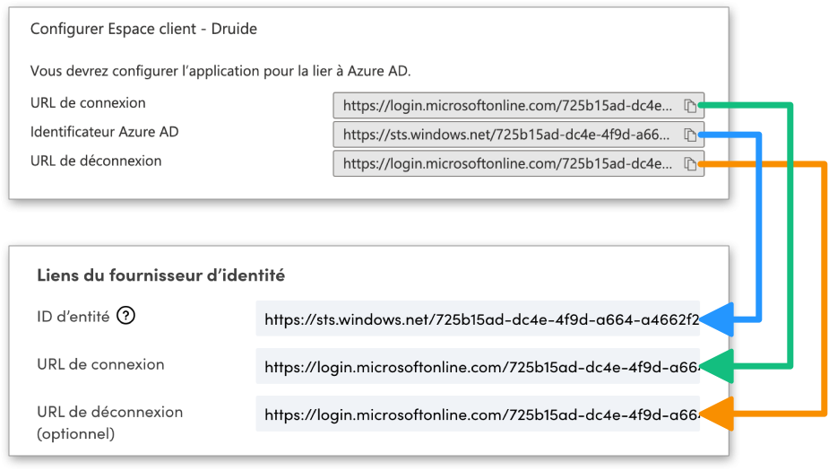 1.1 Copiez le contenu du deuxième champ dans Entra ID, Identificateur Entra ID, et collez-le dans le premier champ de l’Espace client, ID d’entité. (Illustré par la flèche bleue.)
