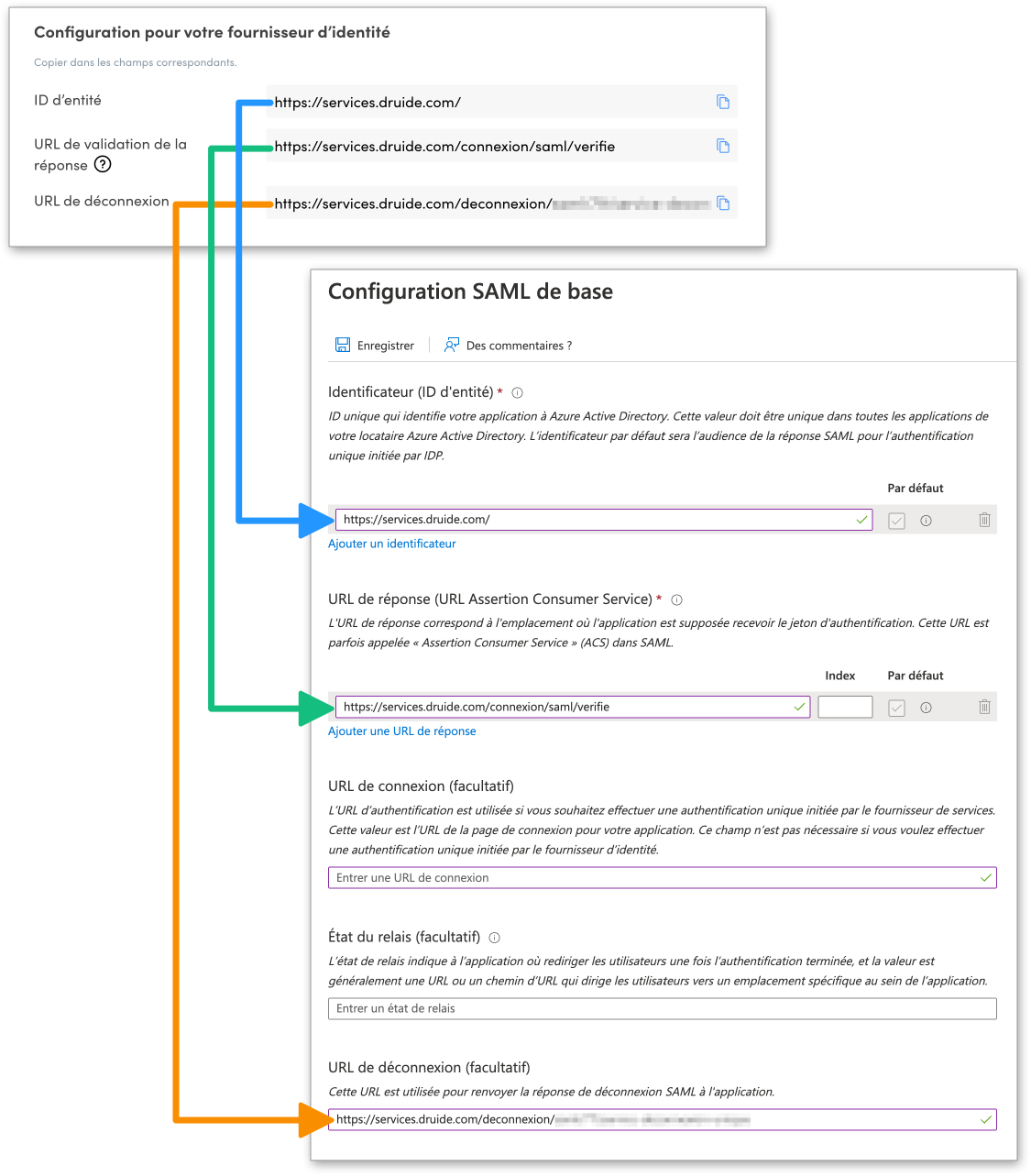 1.3 Copiez le contenu du champ URL de déconnexion dans Entra ID et collez-le dans le champ URL de déconnexion (optionnel) de l’Espace client. (Illustré par la flèche orange.)