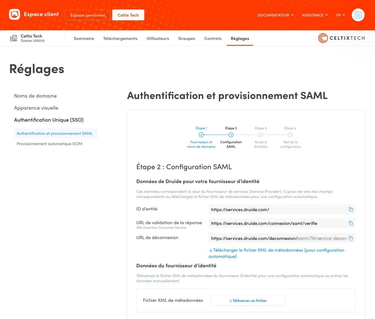 Retournez dans la fenêtre de l’Espace client à l’Étape 2 : Configuration SAML. Cliquez sur Téléverser un fichier et sélectionnez le fichier de métadonnées IdP que vous venez de télécharger à partir de Google Cloud.