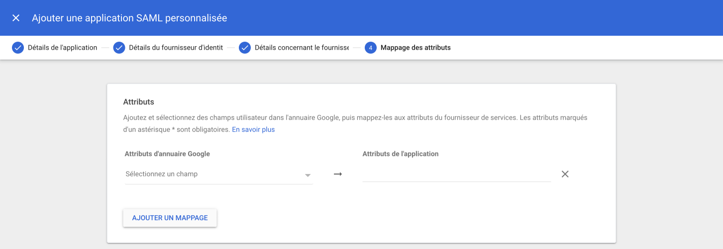 Cliquez sur Ajouter un mappage (A), ensuite cliquez sur le menu Sélectionnez un champ sous Attributs d’annuaire Google (B) pour définir chacun des attributs de l’utilisateur dans l’annuaire Google.