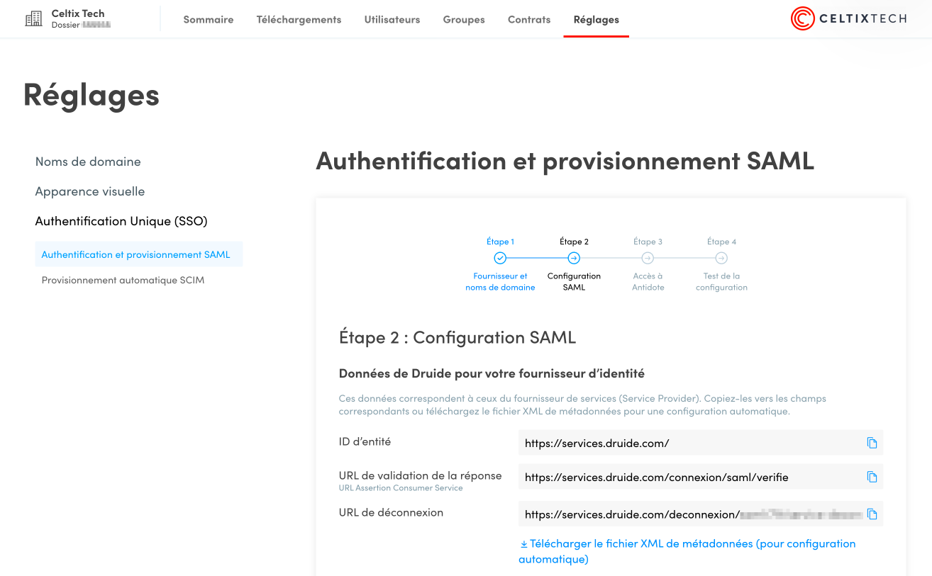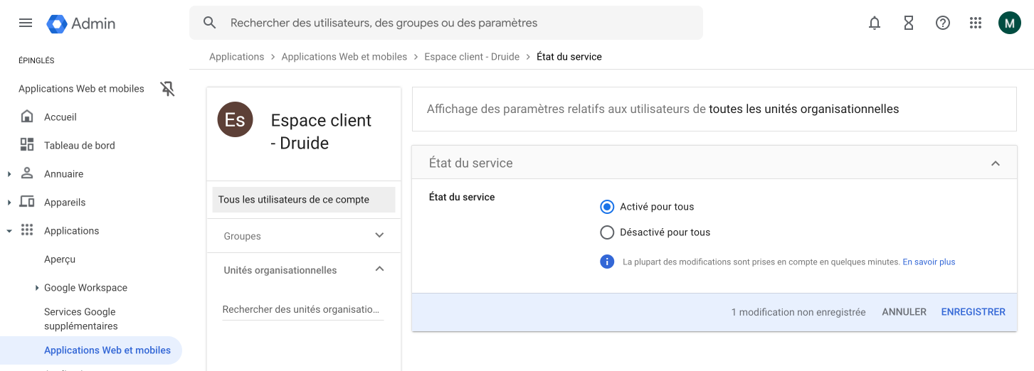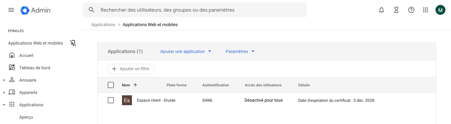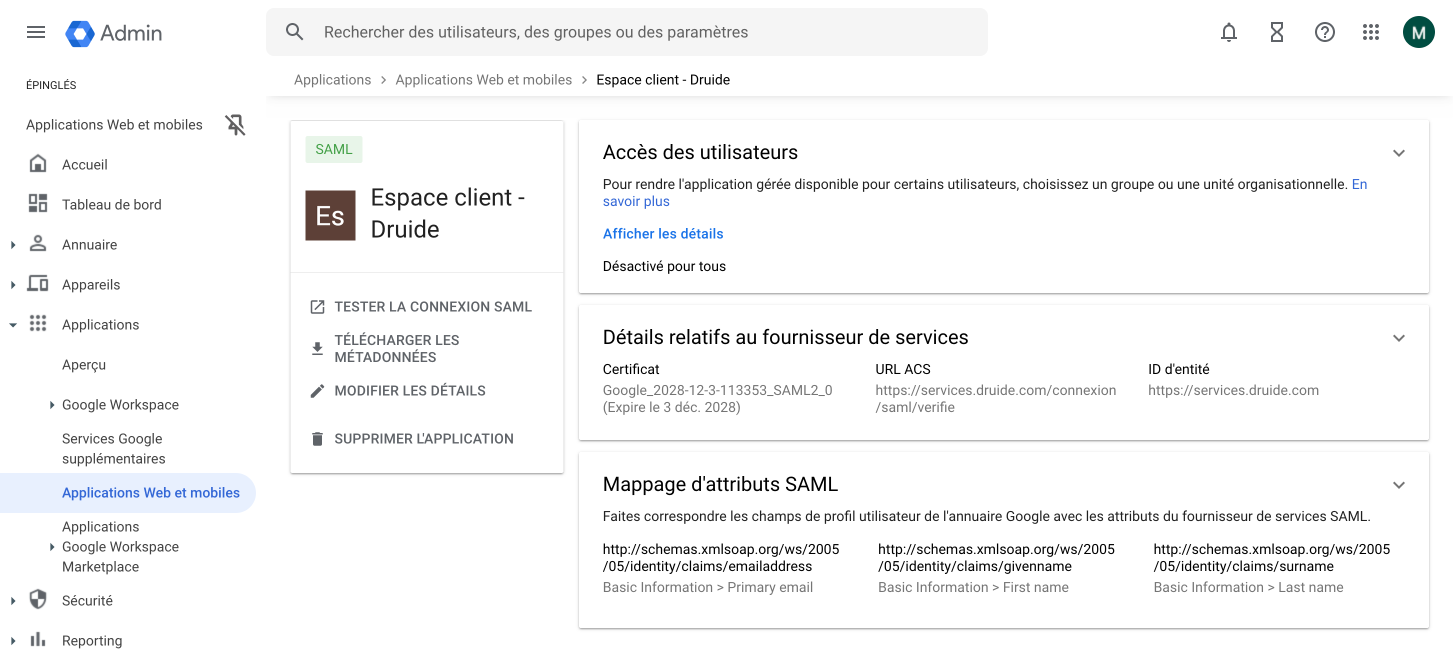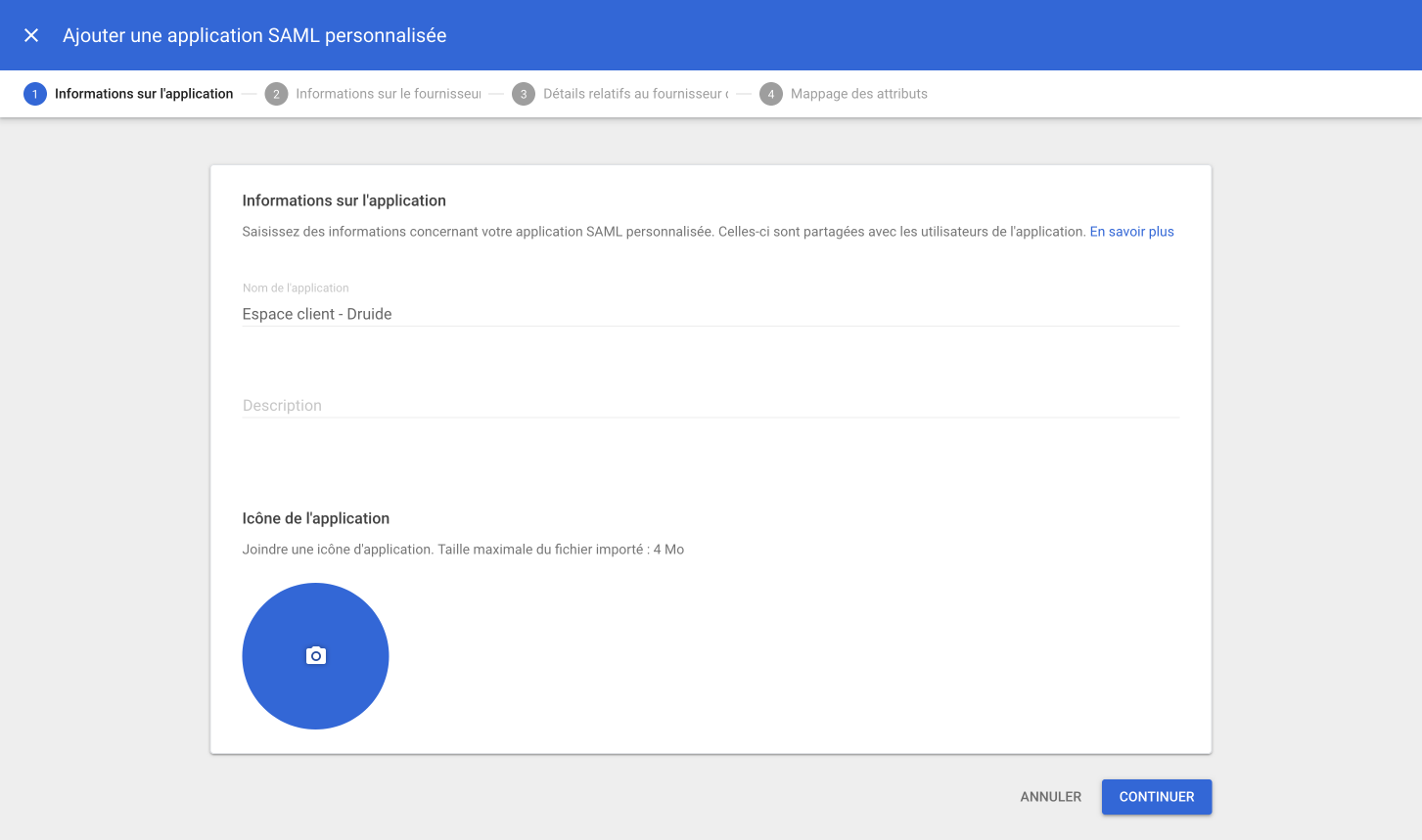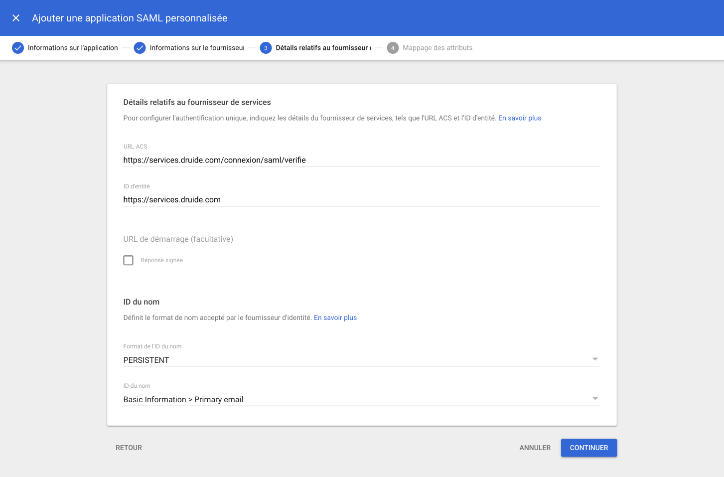 Laissez cette fenêtre ouverte et commencez la configuration Google Cloud dans une nouvelle fenêtre de votre navigateur. Dans les prochaines étapes, vous devrez y copier-coller certaines informations tirées de la section Données de Druide pour votre fournisseur d’identité.