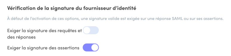 Important - Les paramètres de vérification de la signature doivent correspondre à ceux définis dans Google Cloud, sinon l’authentification SAML échouera.