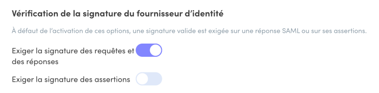 - Réponse signée cochée — Assurez-vous d’ajuster les paramètres dans votre Espace client pour qu’ils correspondent à la configuration indiquée ci-dessous.