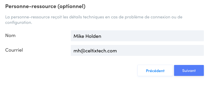 Il est recommandé d’inscrire une personne-ressource pour recevoir les détails techniques en cas de problème de connexion ou de configuration.