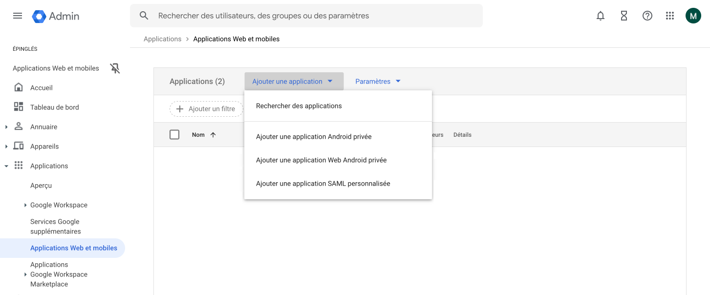 Connectez-vous à votre Console d’administrateur Google. Dans le menu à gauche, cliquez sur Applications (A) et ensuite sur Applications Web et mobiles (B).