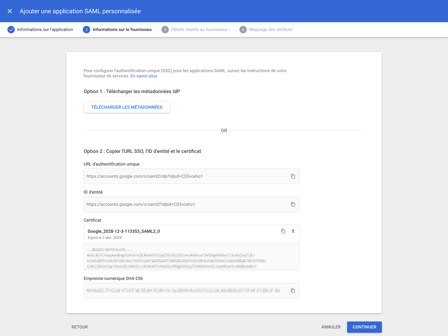 Référez-vous à l’étape 7 de la section A de cette procédure et retournez dans la fenêtre où vous préparez l’Espace client. Dans l’écran Détails relatifs au fournisseur de services de l’assistant de configuration Google Cloud :