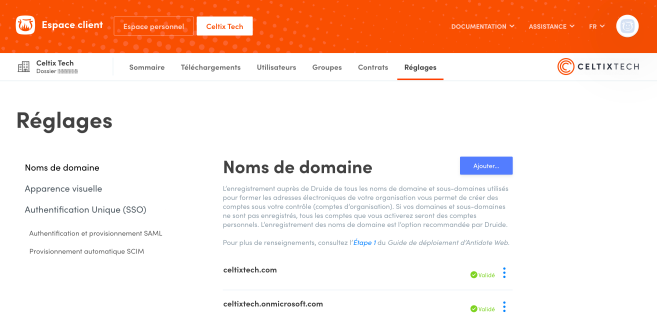 Vérifiez que tous les noms de domaine nécessaires pour l’authentification SAML ont été ajoutés et validés. Si vous devez en ajouter un, consultez les instructions présentées dans la section Noms de domaine du guide d’utilisation.
