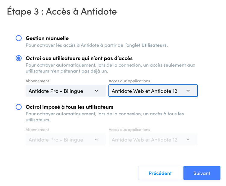 - Si votre organisation a un ou plusieurs abonnements actifs à Antidote, choisissez comment vous souhaitez gérer son accès. Trois options s’offrent à vous :