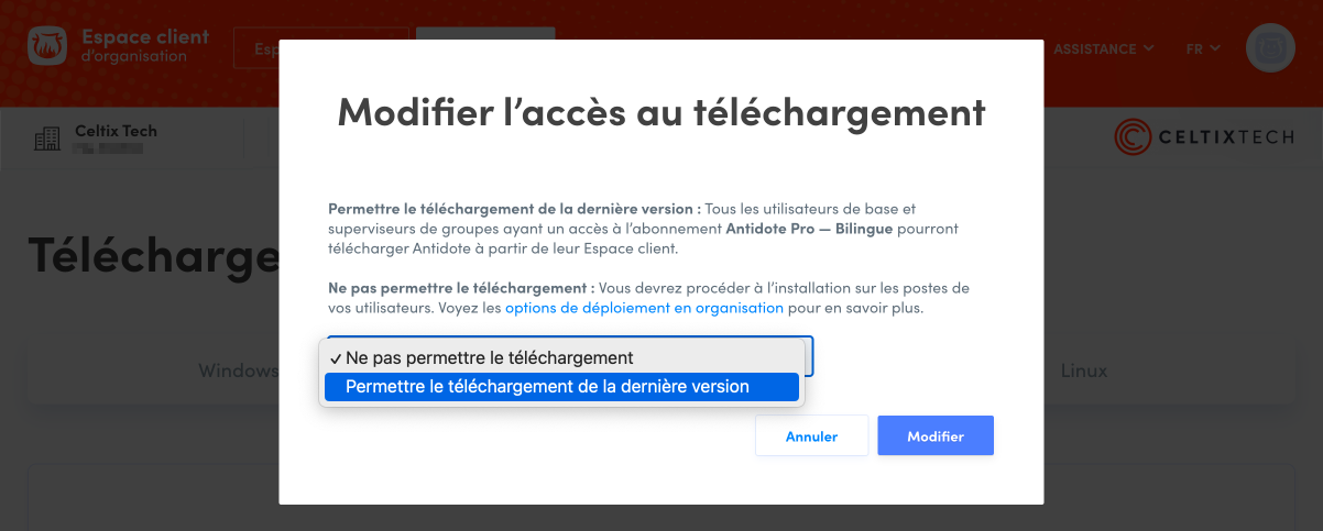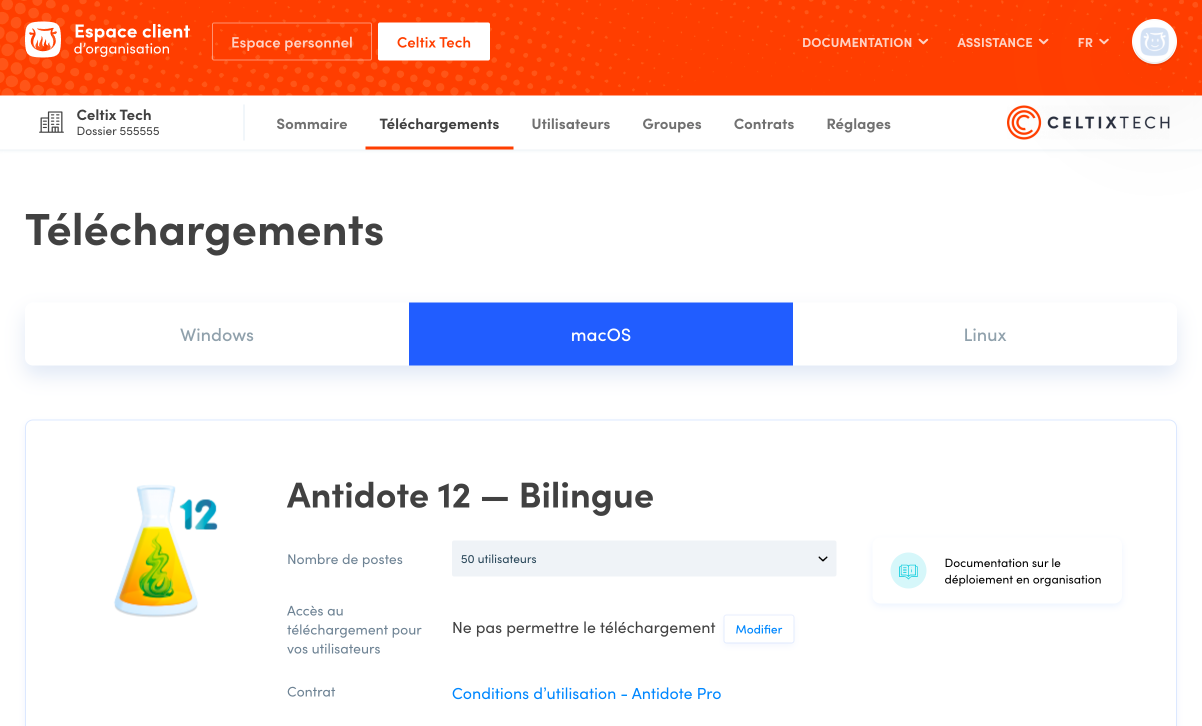 Vous devez d’abord permettre à vos utilisateurs de télécharger les installateurs d’Antidote à partir de leur Espace client. Par défaut, seuls les techniciens et administrateurs y ont accès.